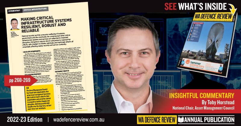 View WA Defence Review’s latest Annual Publication to read commentary by Toby Horstead, National Chair, Asset Management Council, who emphasises the necessity of developing resilience within critical infrastructure systems in an era of increased challenges and complexity.
