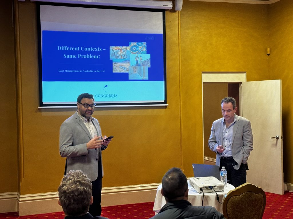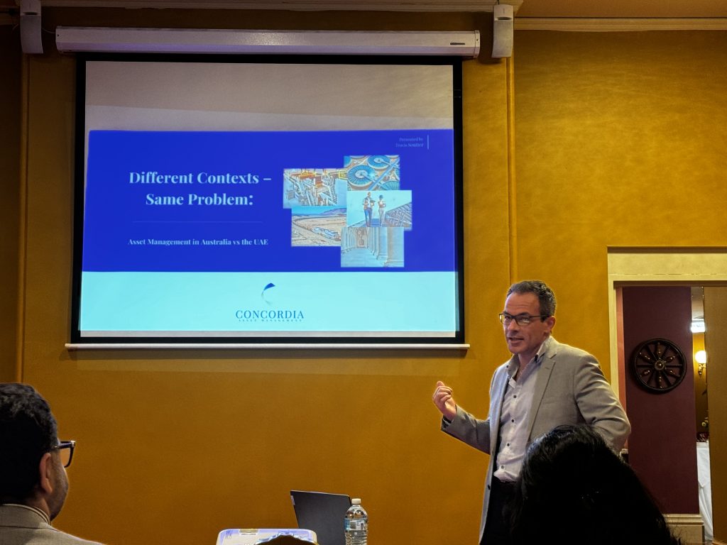 Last night, the Asset Management Council’s Melbourne Chapter hosted an engaging technical meet titled “Different Contexts – Same Problems: A discussion about how AM is undertaken in Australia vs the UAE.” This insightful event featured a presentation by Travis Soutter, Managing Director of Concordia Asset Management. Travis guided the attendees through a comparative analysis of asset management practices in Australia and the UAE, highlighting how both regions, despite their distinct landscapes, regulatory frameworks, and economic conditions, face similar challenges.